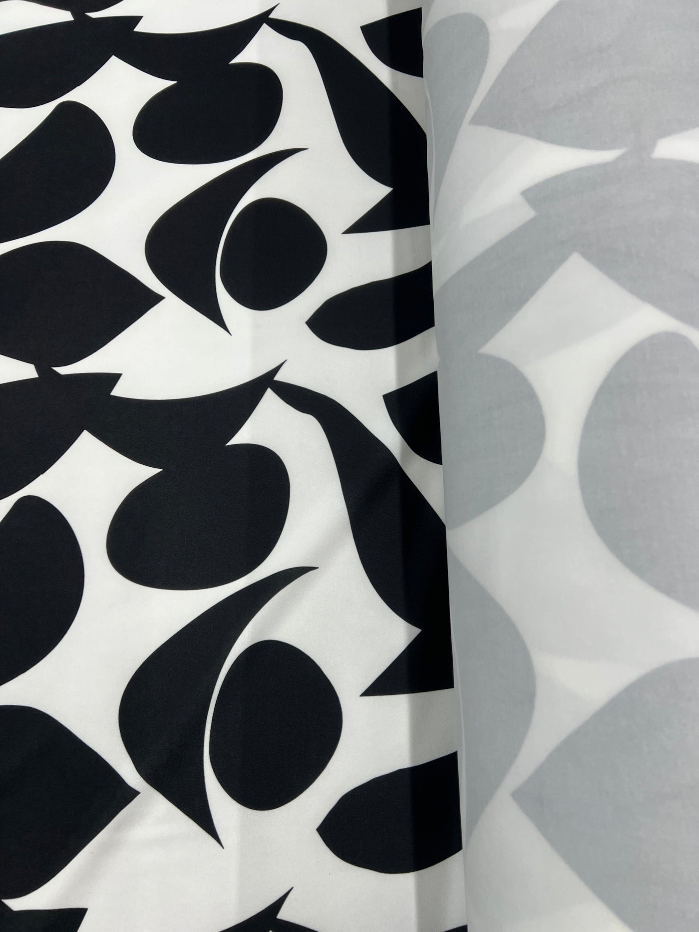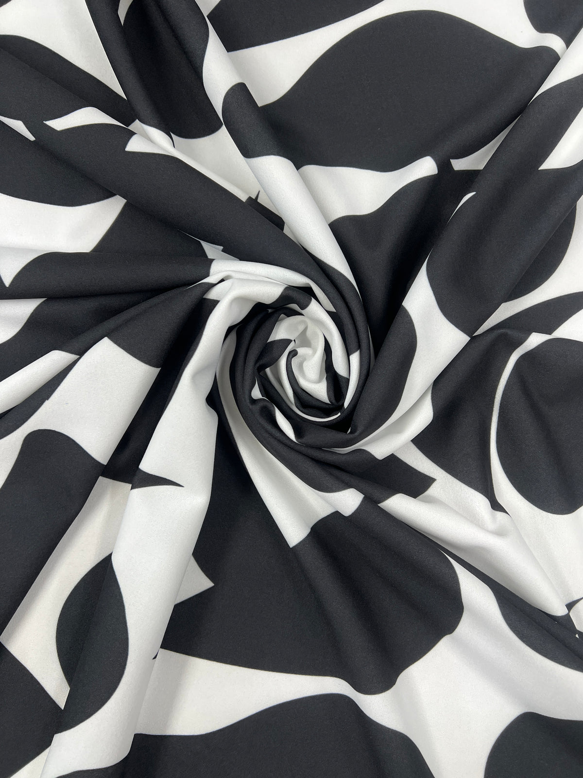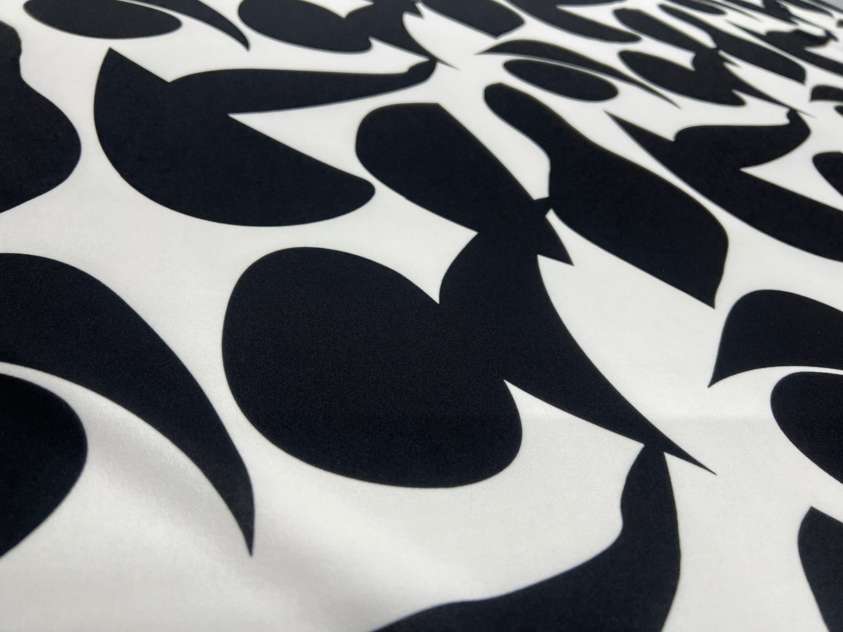 A bold and modern black and white abstract stretch fabric, featuring flowing black shapes on a crisp white base. The smooth surface and soft handle create a beautiful drape while remaining lightweight, breathable and comfortable to wear.