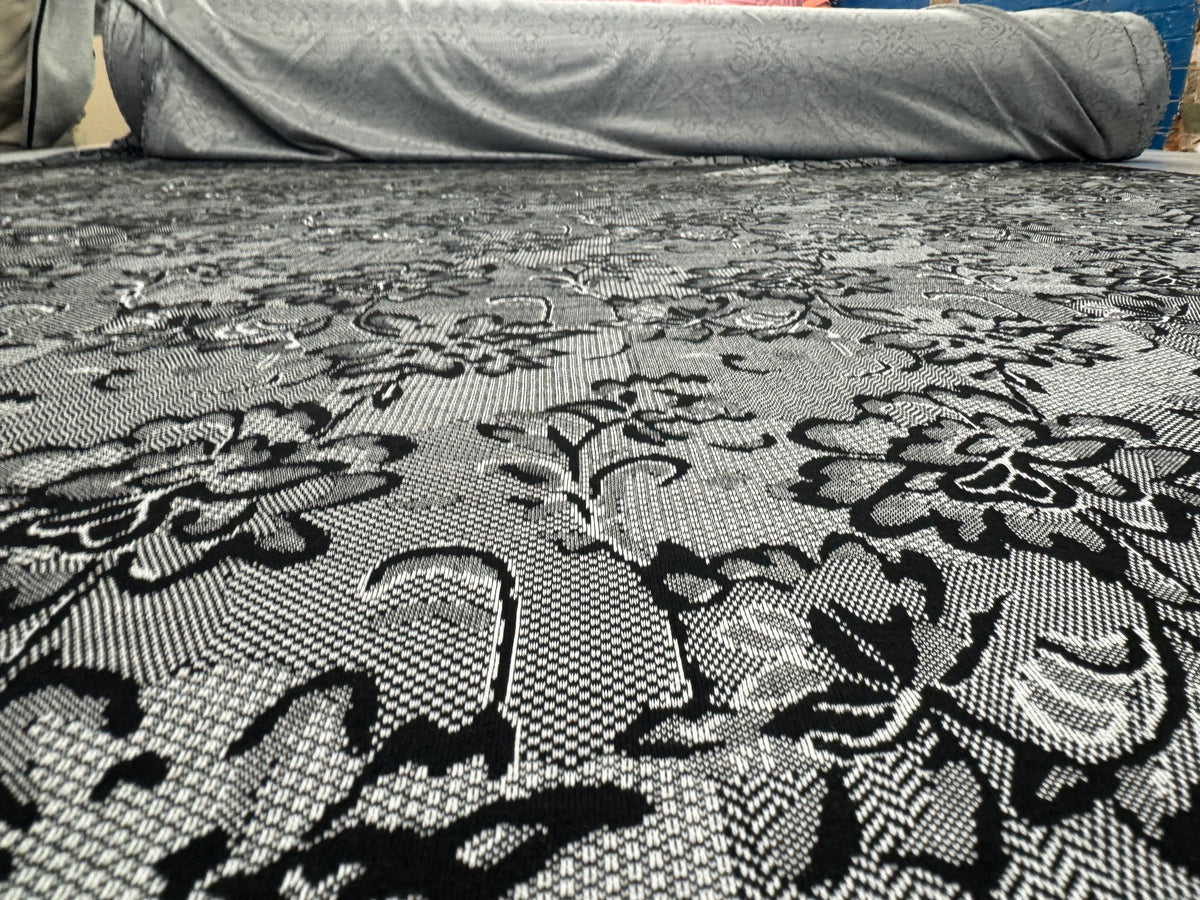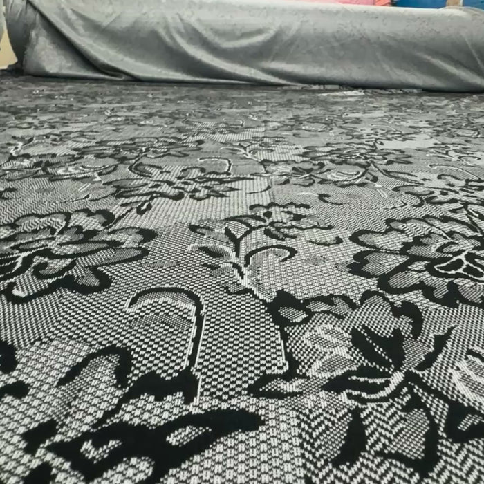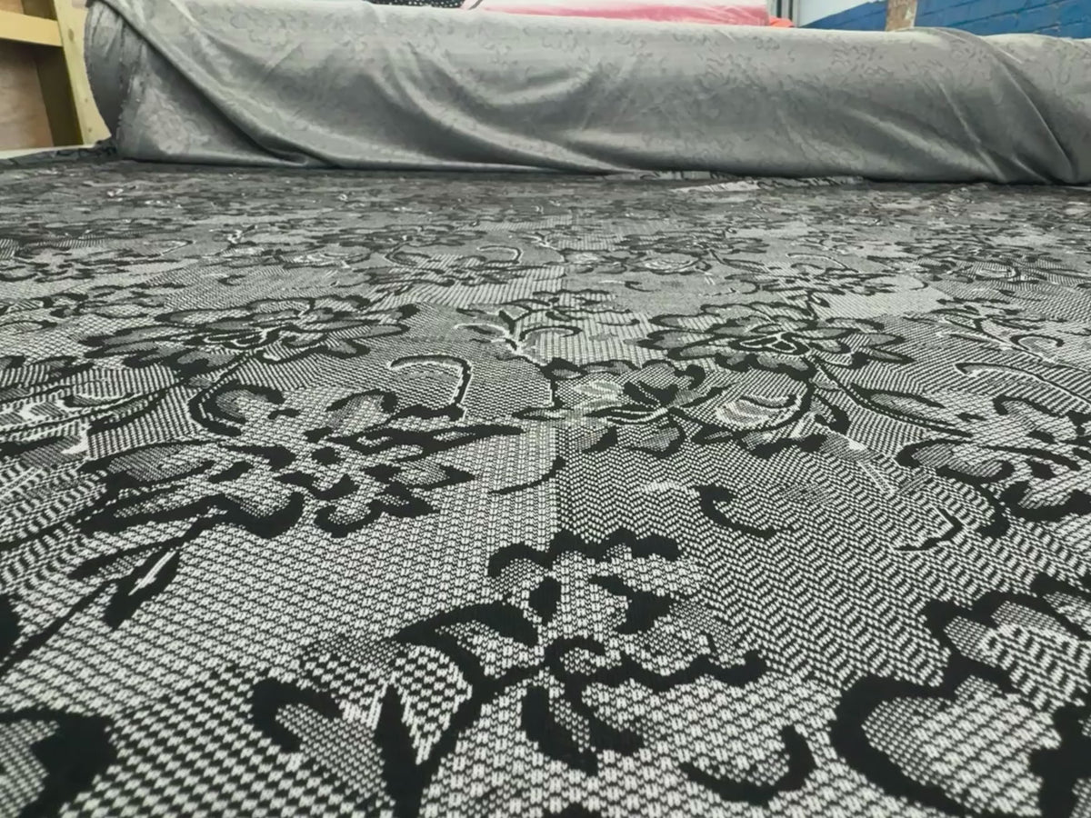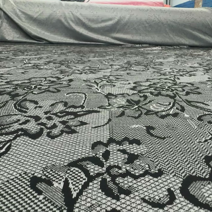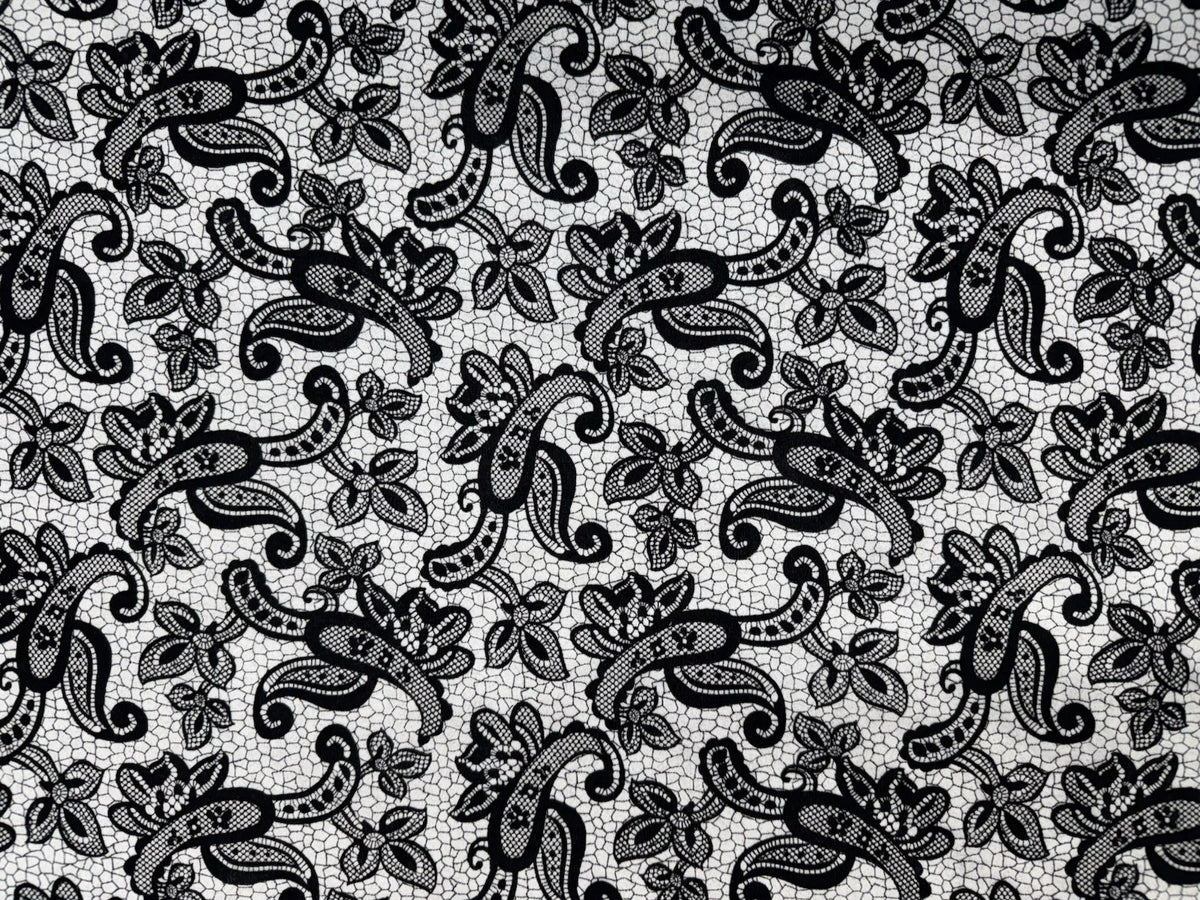 Transform your next dressmaking or creative project with this beautiful Black & White Textured Lace Print Jersey Fabric — a stylish, comfortable, and versatile textile choice!