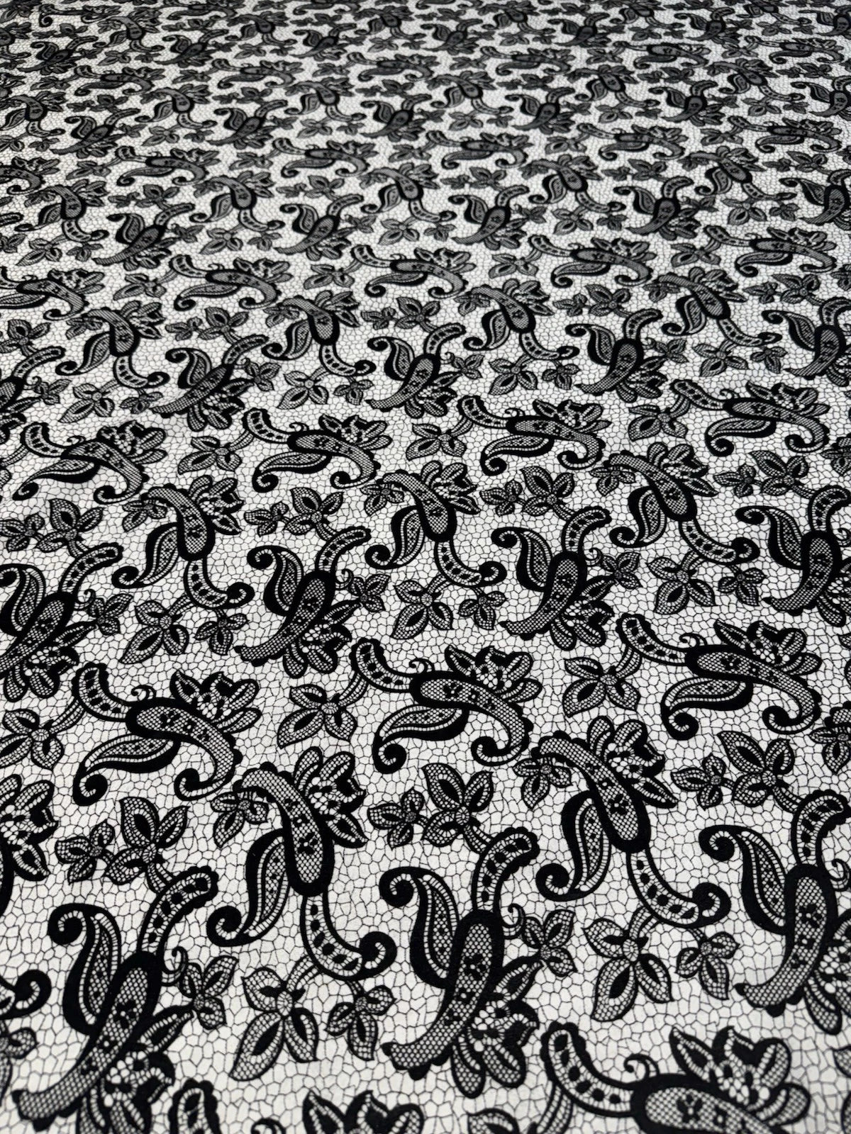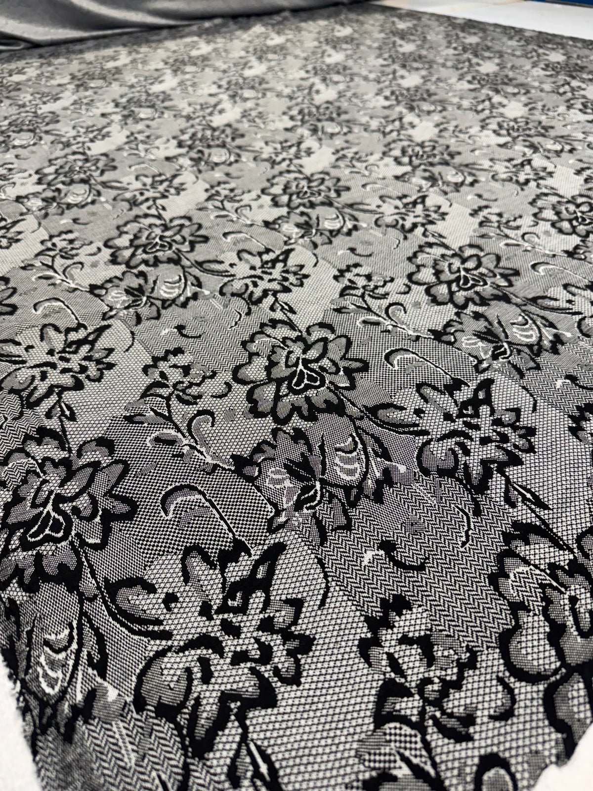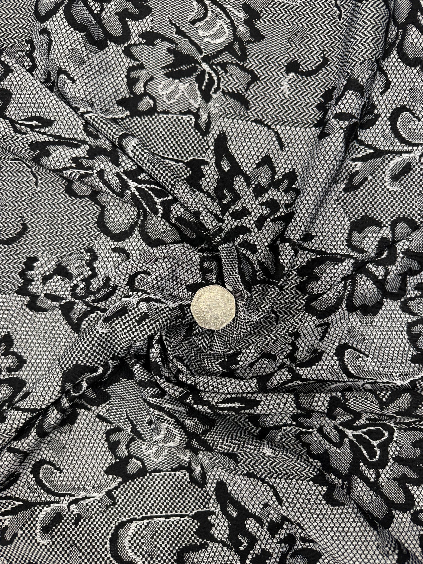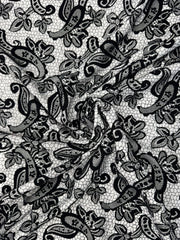 Transform your next dressmaking or creative project with this beautiful Black & White Textured Lace Print Jersey Fabric — a stylish, comfortable, and versatile textile choice!