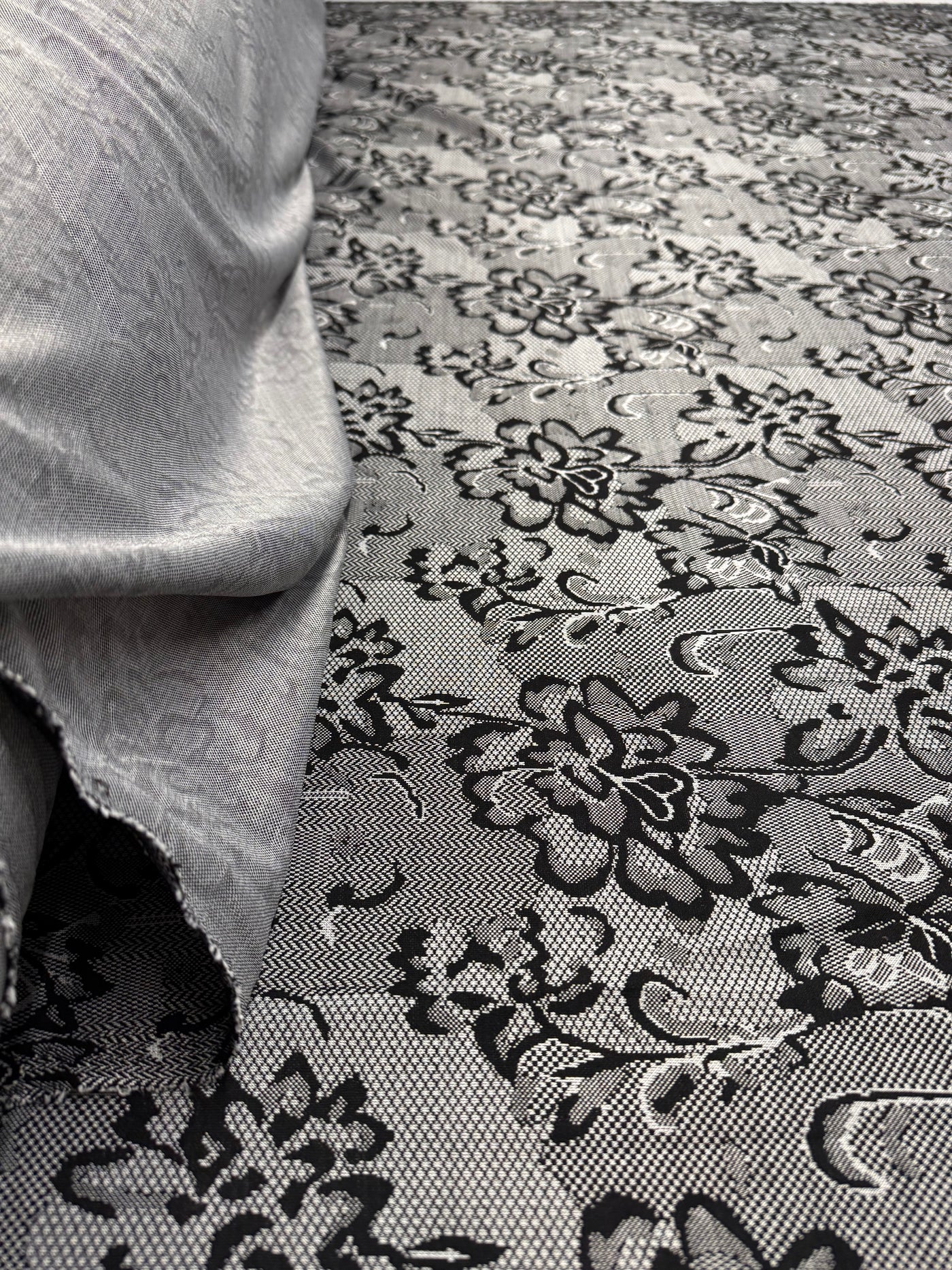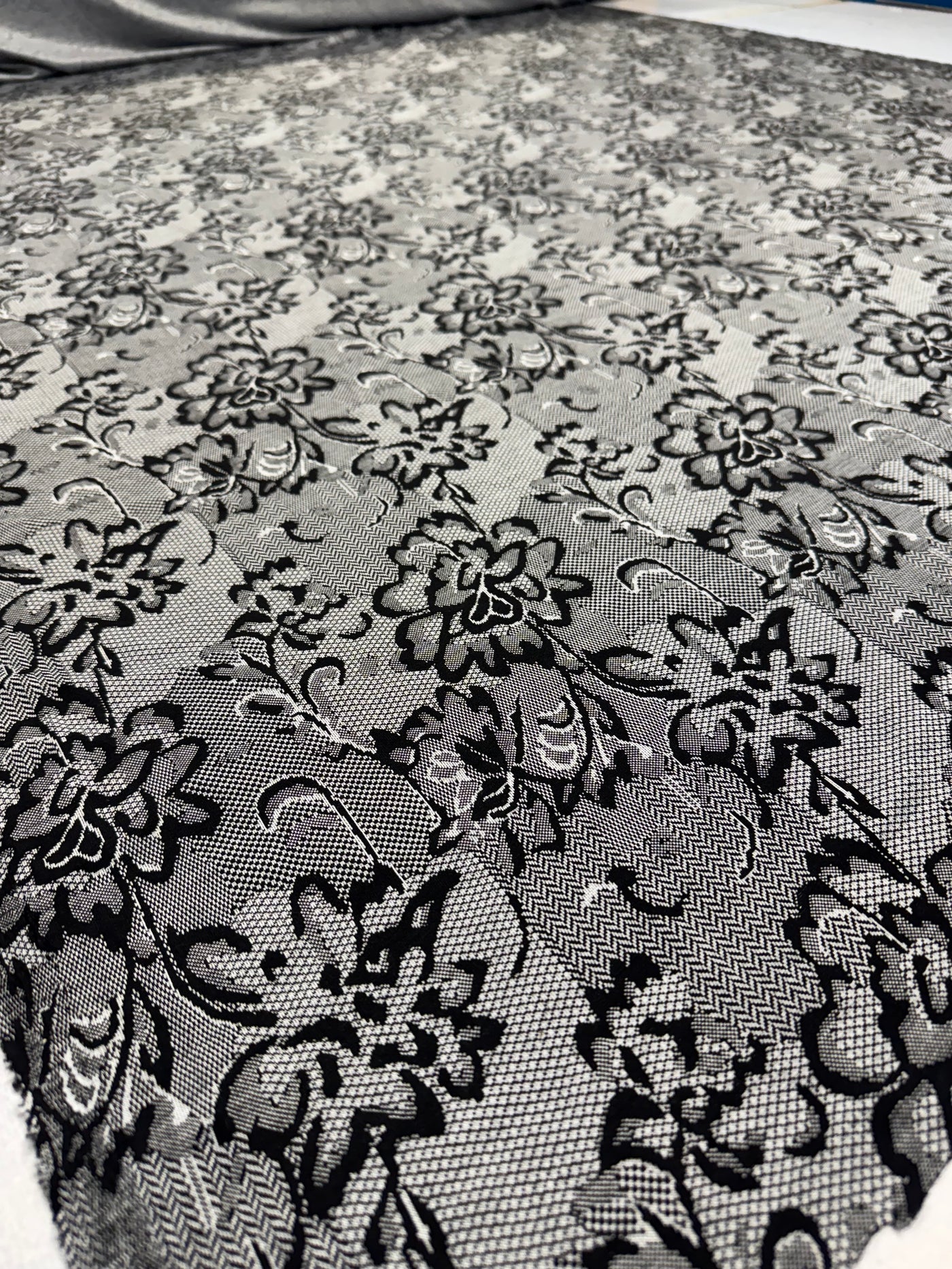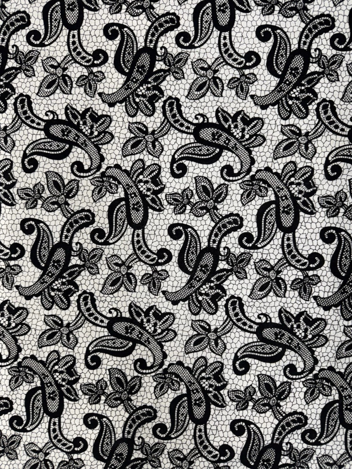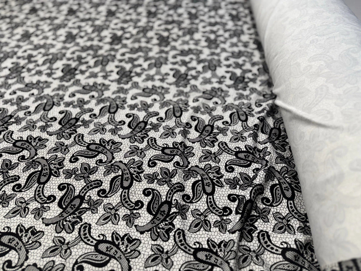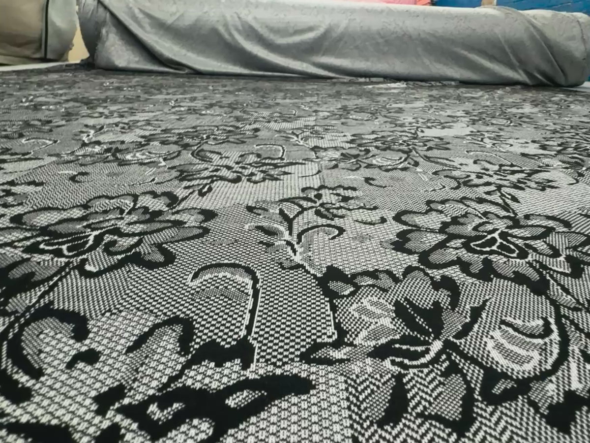 Add chic sophistication and modern flair to your sewing projects with this Black & White Textured Lace Print Jersey Fabric — a versatile and stylish choice for makers, designers, and craft lovers. Featuring a striking monochrome lace-inspired pattern on a smooth stretch jersey base, this fabric brings both comfort and visual impact to every creation.