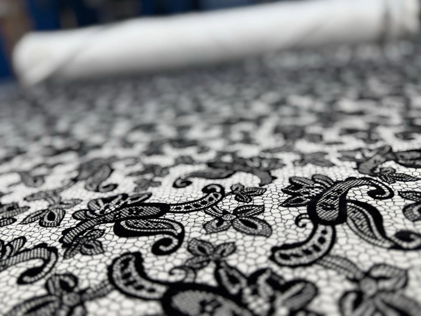 Elegant Monochrome Design: Classic black lace-effect motifs against a crisp white background create an eye-catching tessellated pattern perfect for standout garments.