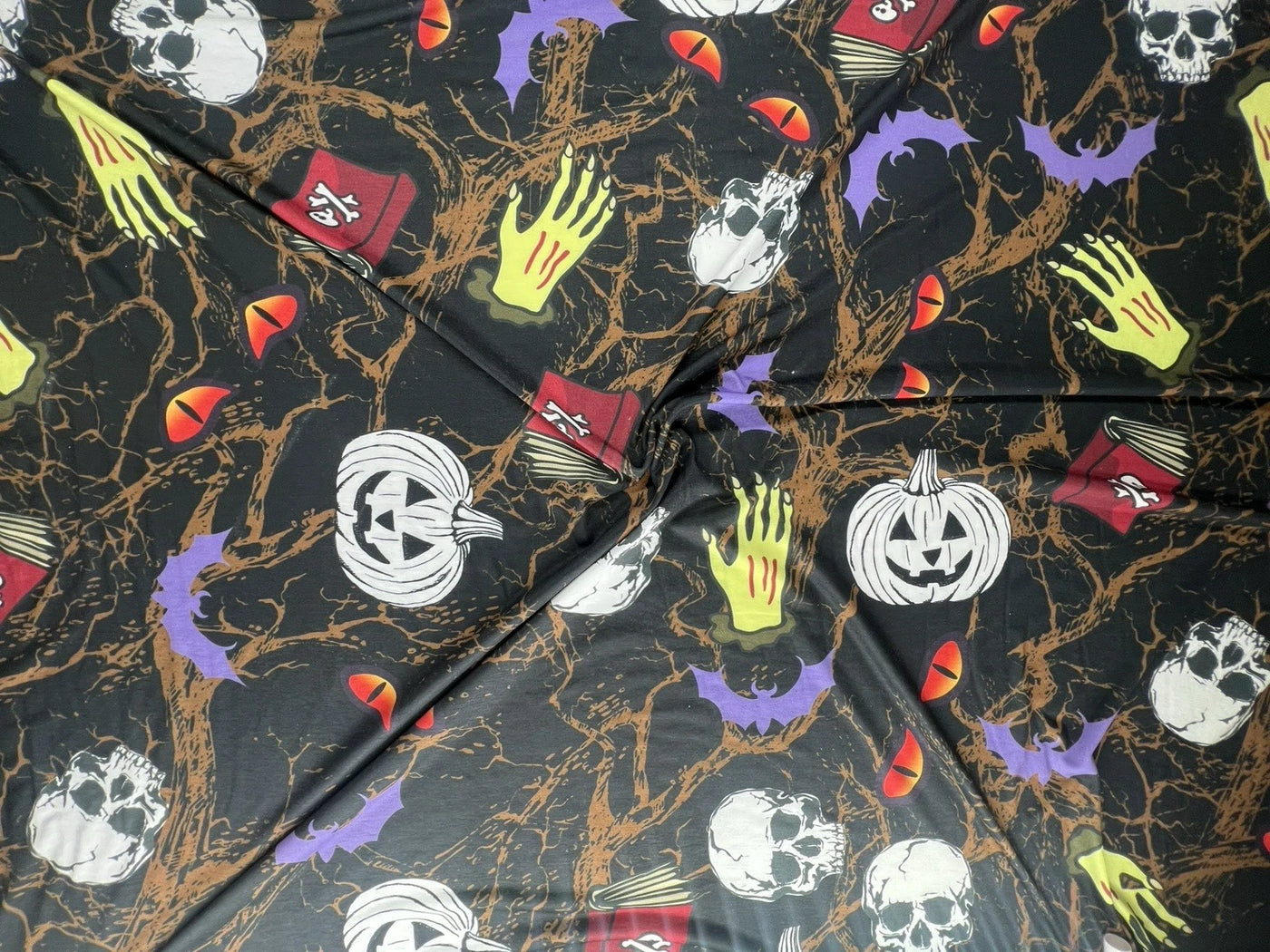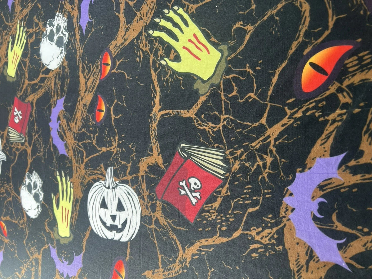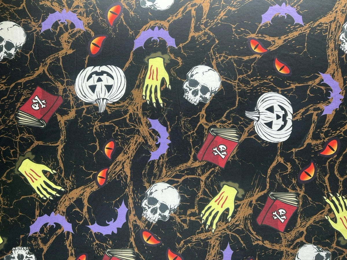 Get into the spooky spirit with this Halloween-themed spun polyester jersey fabric, featuring a playful mix of skulls, pumpkins, bats, spell books, eerie eyes, and creepy hands set against a dark black background with tangled branch details. This fun and slightly gothic design is perfect for festive makes and statement garments during the Halloween season and beyond.