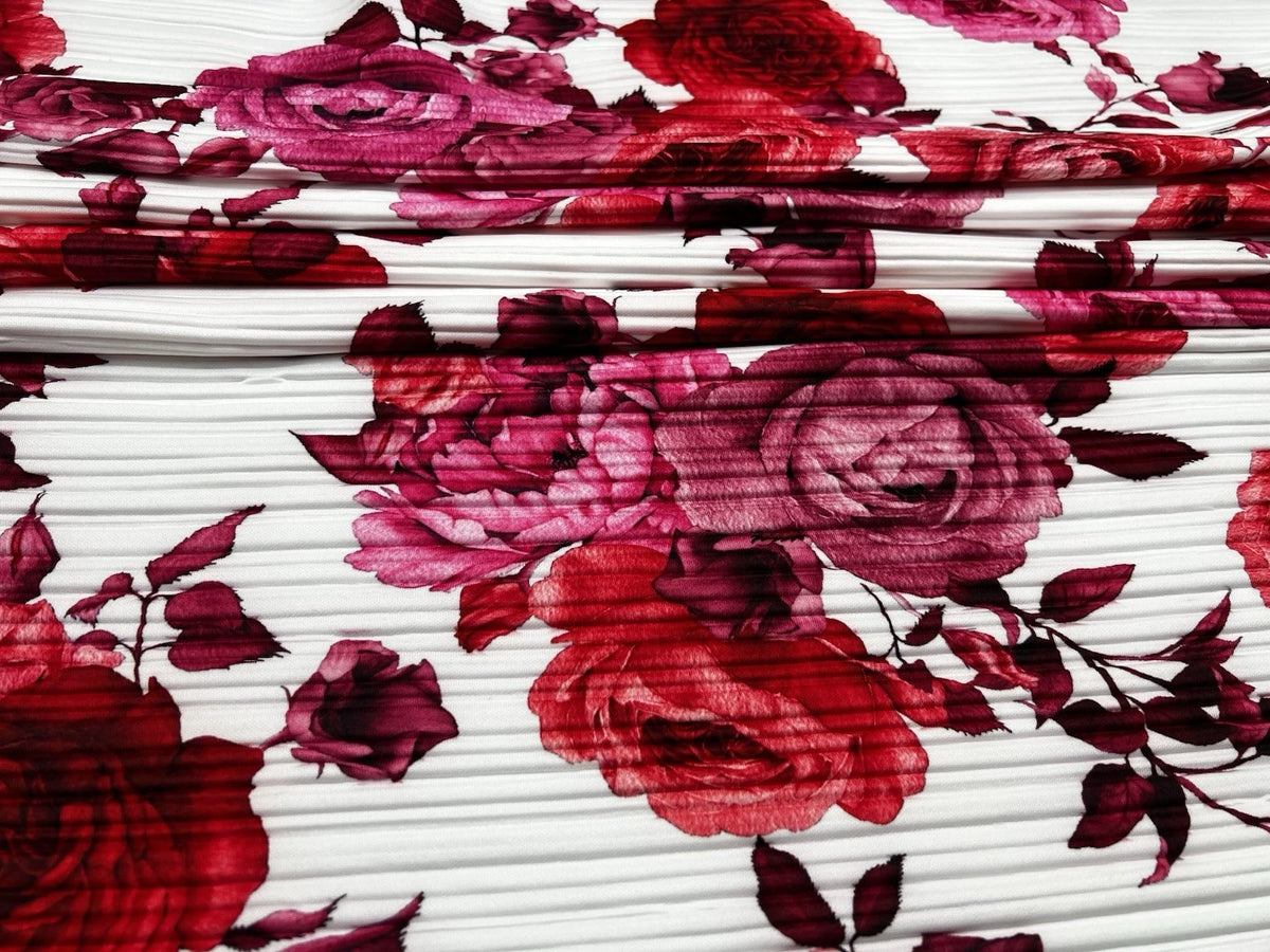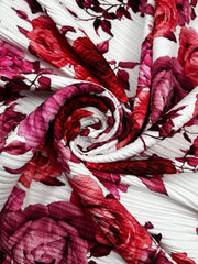 Red Pink Rose Floral Print Pleated Plisse Fabric - Flowing Dress Skirt 150cm