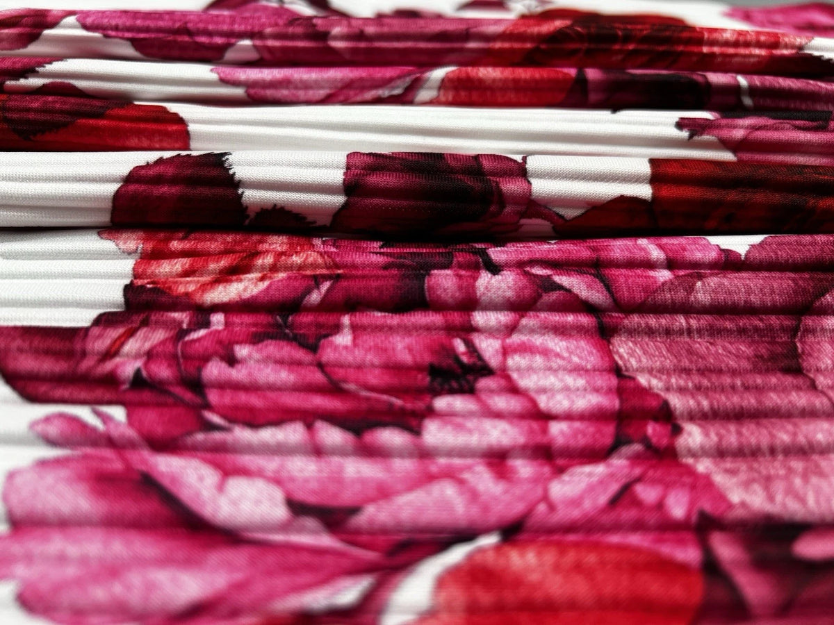 Red Pink Rose Floral Print Pleated Plisse Fabric - Flowing Dress Skirt 150cm - Sample