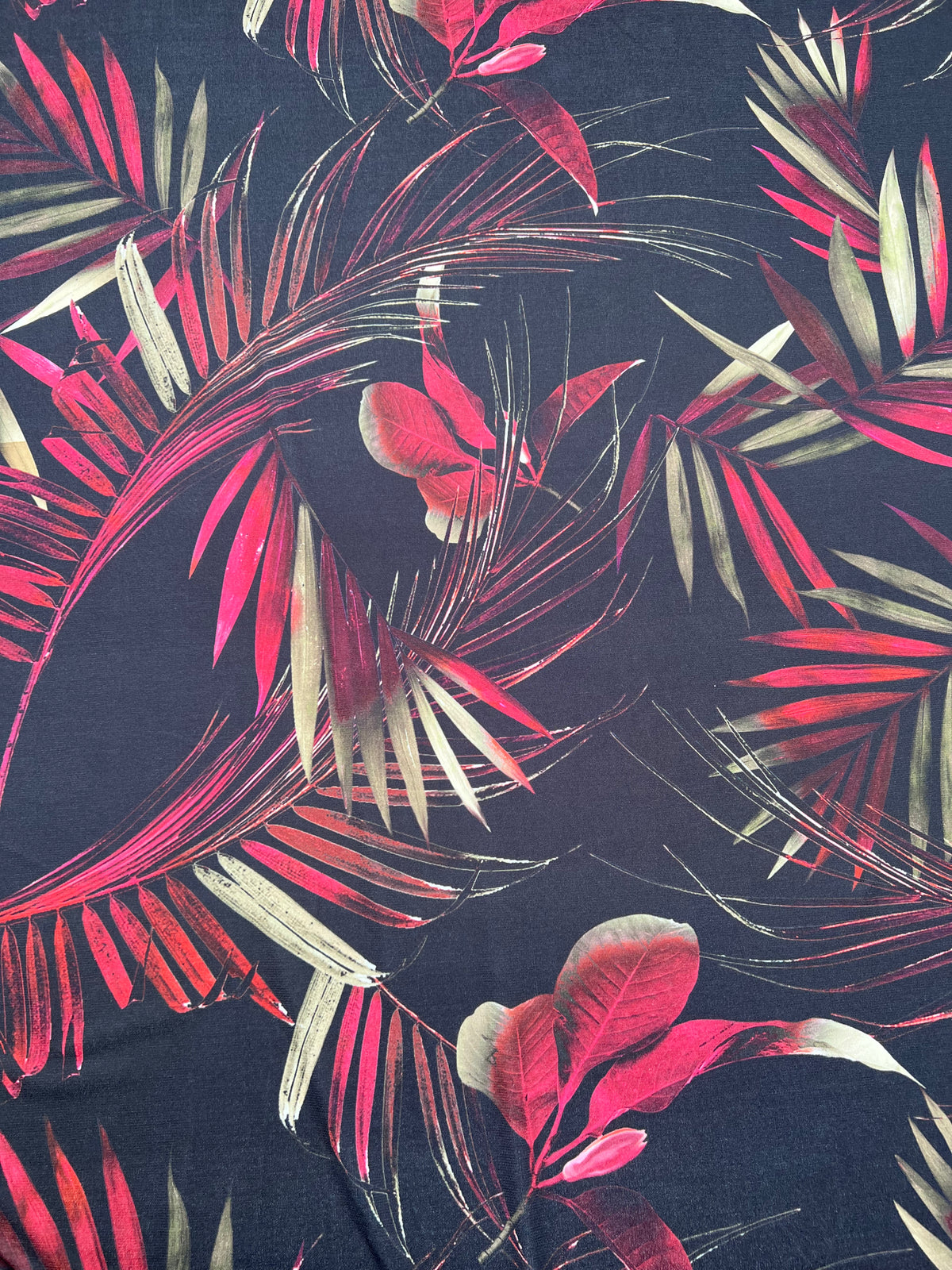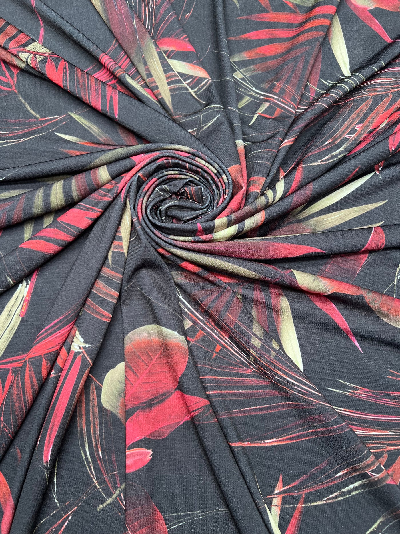 Exotic Dark Tropical Leaf Stretch Knit – Berry Red & Khaki Poly Spandex Fabric 🌺🌴✨ This vibrant tropical knit features...