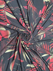 Exotic Dark Tropical Leaf Berry Red/Khaki Poly Spandex Knit Fabric 150cm