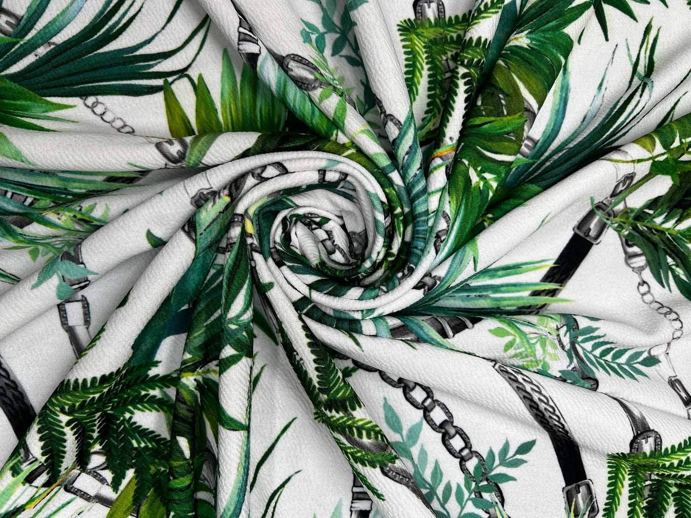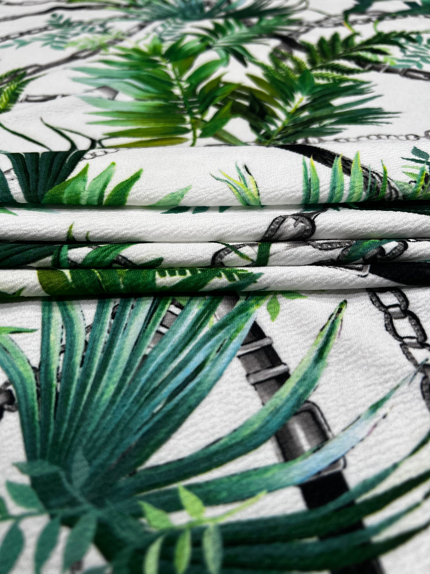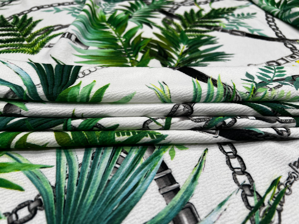 White Tropical Palm Leaf & Black Chain Print Textured Apparel Fabric 148cm - Saample