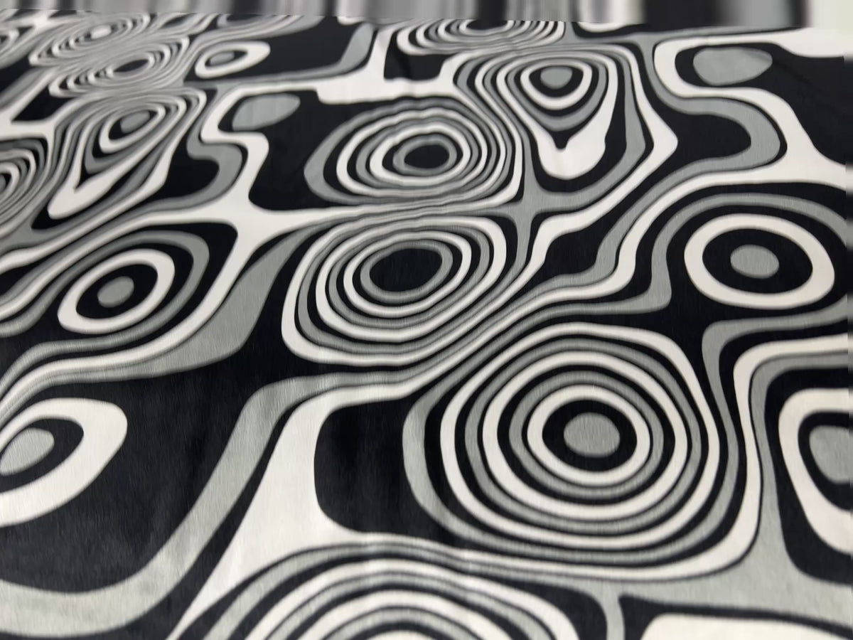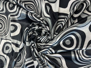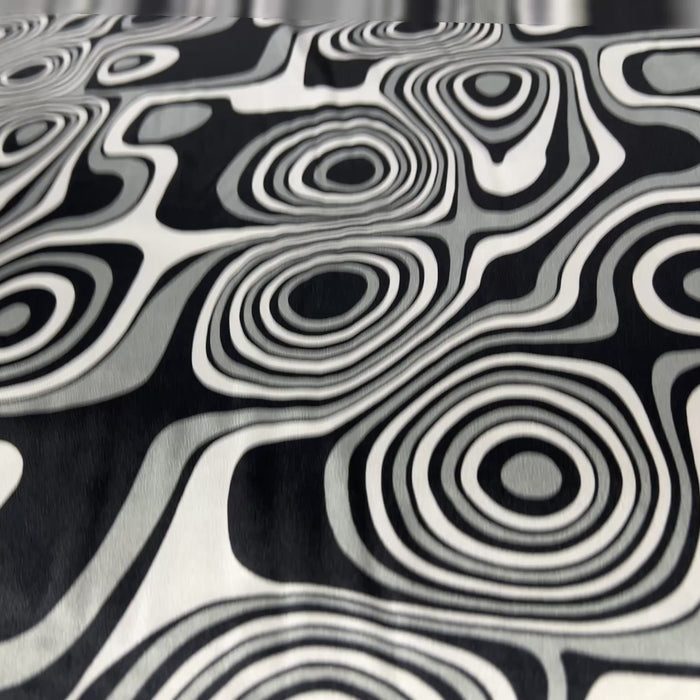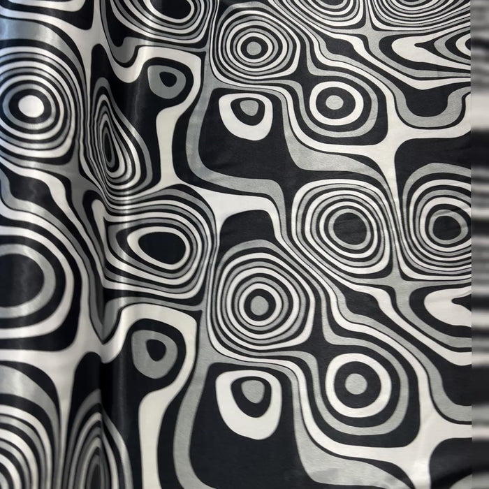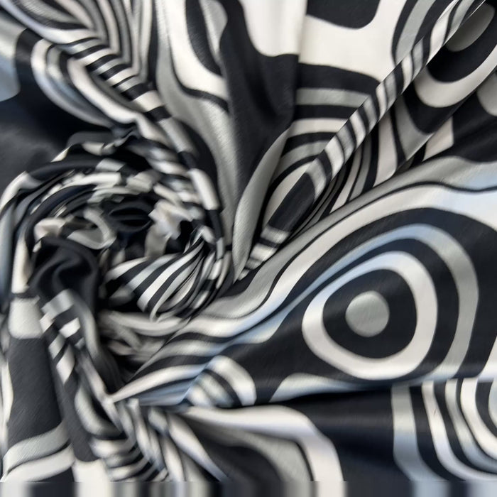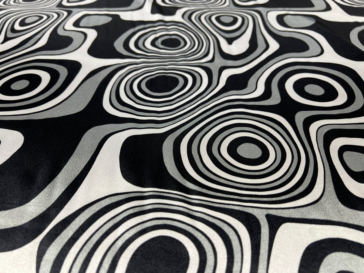 Dressmaking & Statement Fabric – Monochrome Op Art Swirl Satin Fabric – Black & White Psychedelic Print – 145cm - Sample