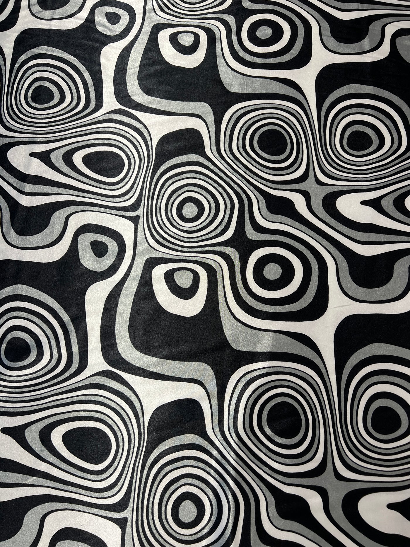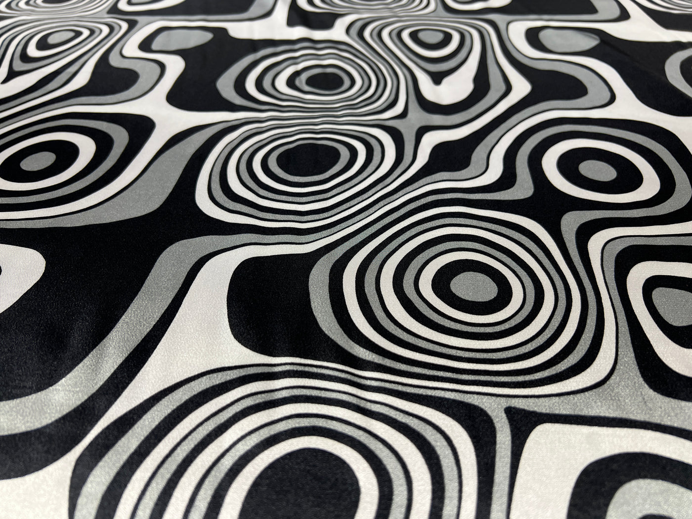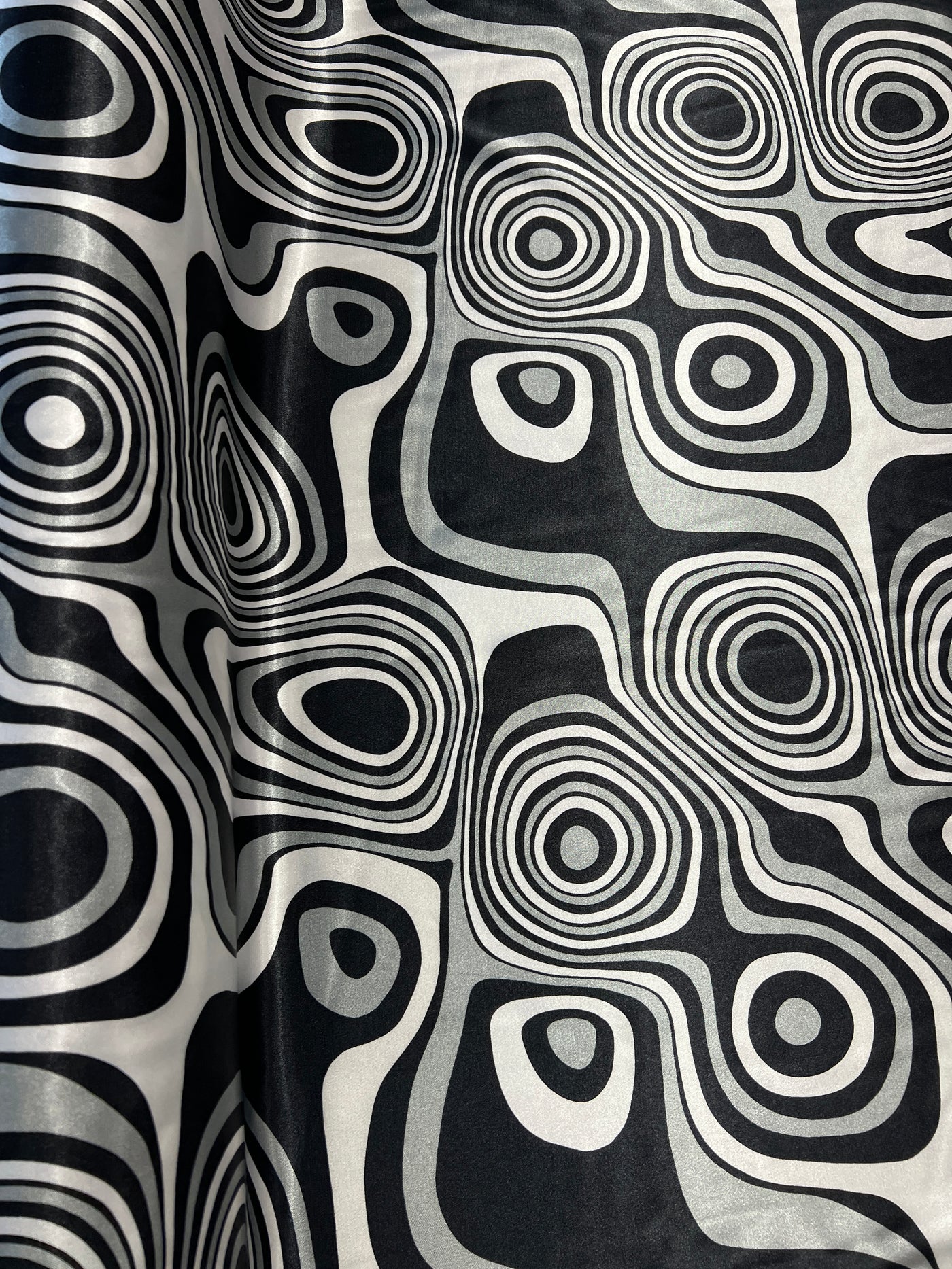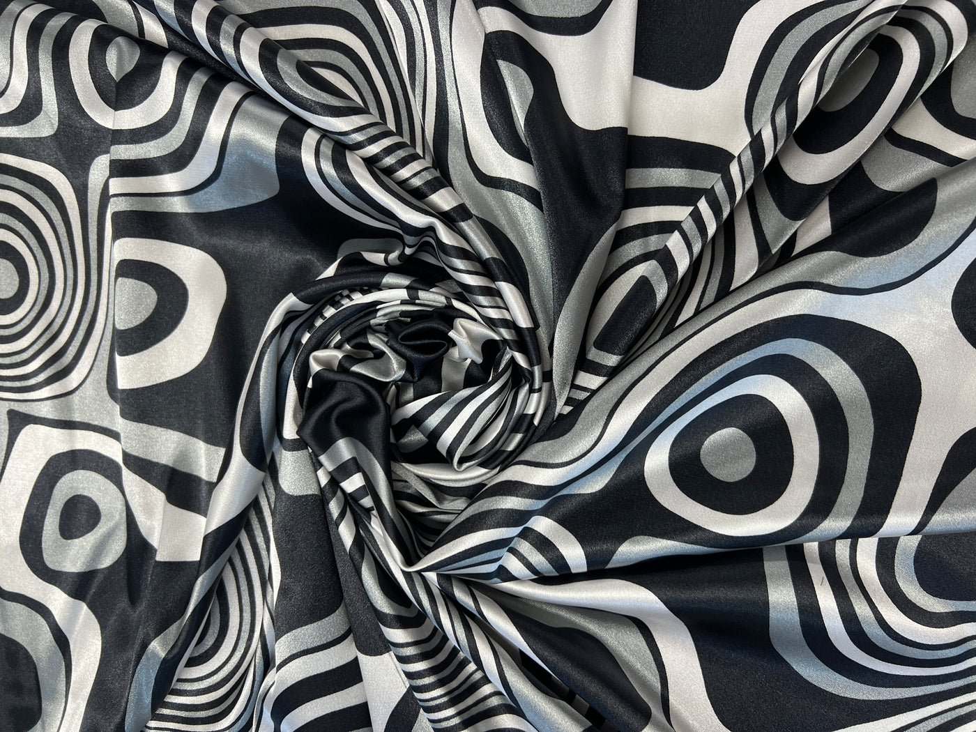 Dressmaking & Statement Fabric – Monochrome Op Art Swirl Satin Fabric – Black & White Psychedelic Print – 145cm - Sample