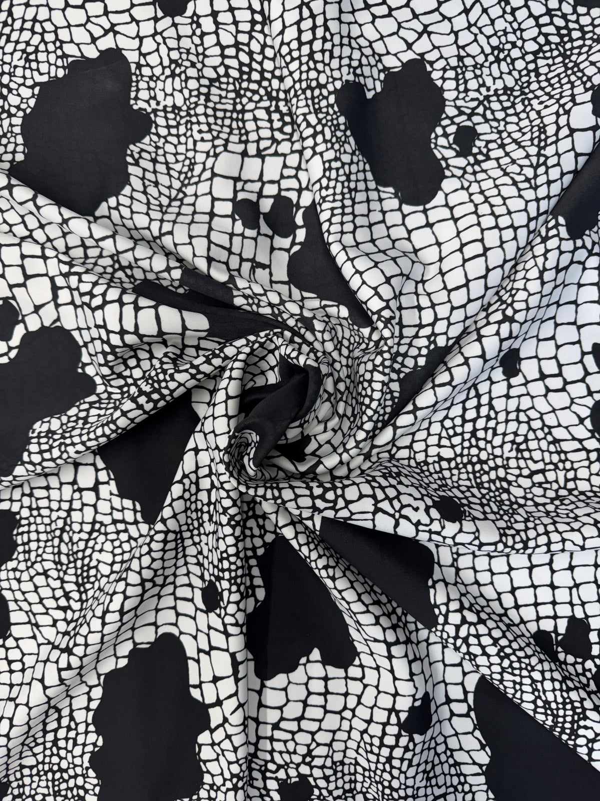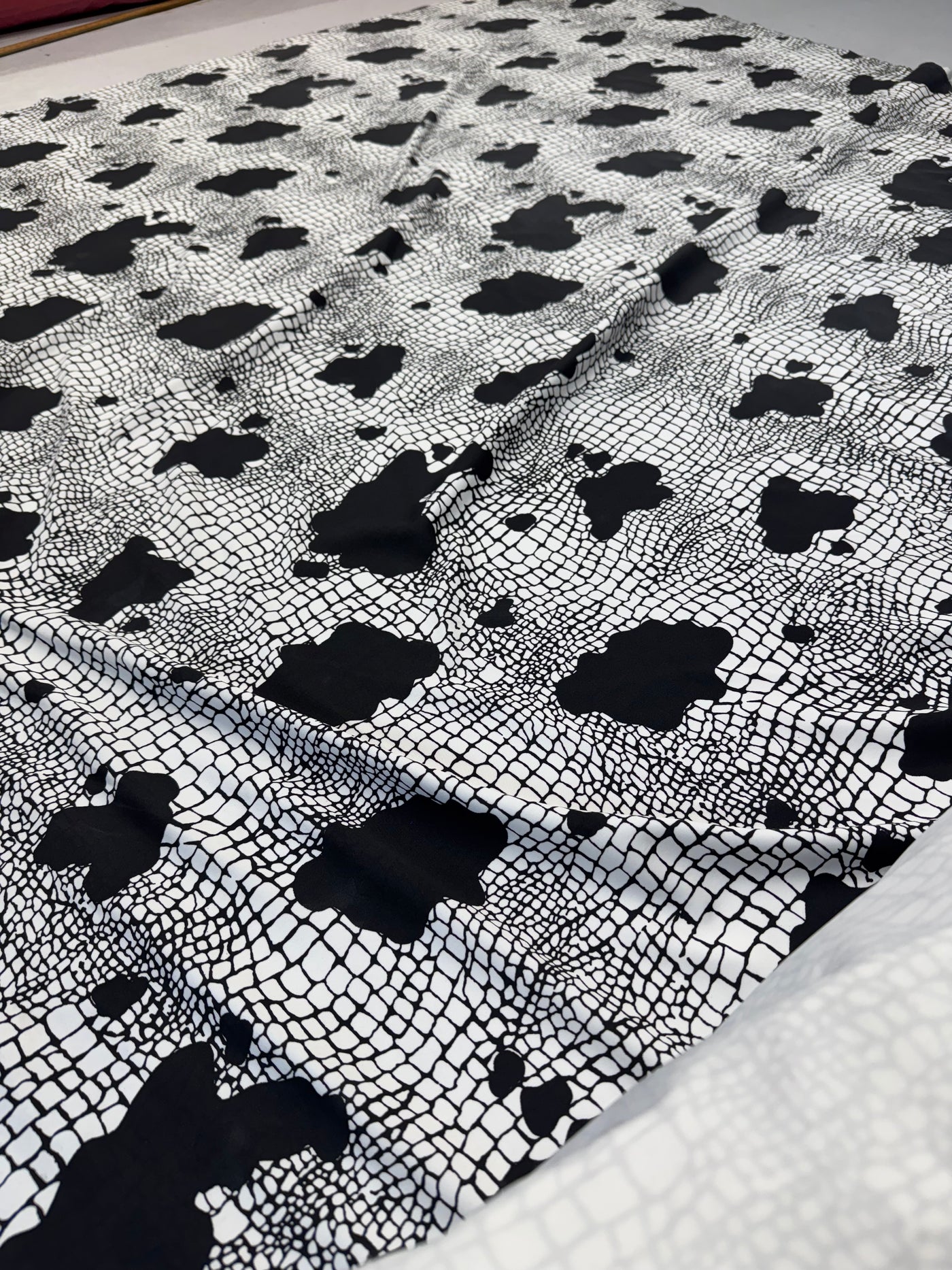 Unleash bold style and creative flair with this striking Black & White Snakeskin Cow Print Stretch Jersey Fabric, perfect for...